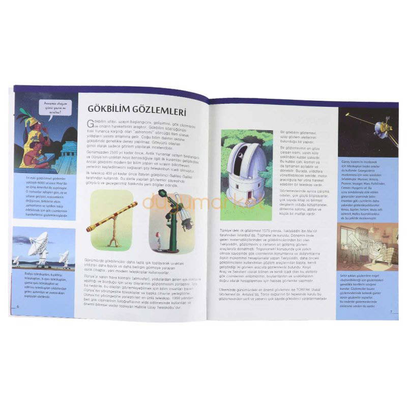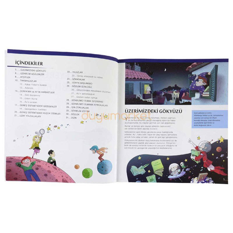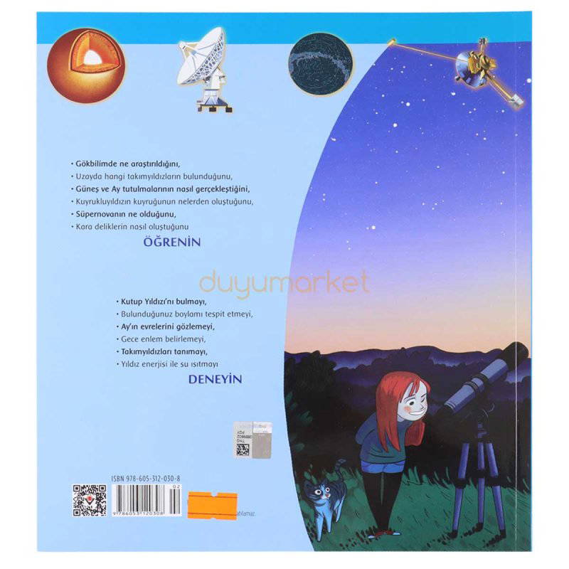 Gökbilimin ne olduğunu; Hangi takımyıldızlar bulunduğunu; Güneş ve Ay tutulmasının nasıl gerçekleştiğini; Kuyrukluyıldızın kuyruğunun neden oluştuğunu; Süpernovanın ne olduğunu; Kara deliklerin nasıl oluştuğunu. Deneyin - Kutup Yıldızı''nı bulmayı; Bulunduğunuz meridyeni tespit etmeyi; Ay''ın evrelerini gözlemeyi; Gece enlem belirlemeyi; Takımyıldızlarını tanımayı; Yıldız enerjisi ile su ısıtmayı.