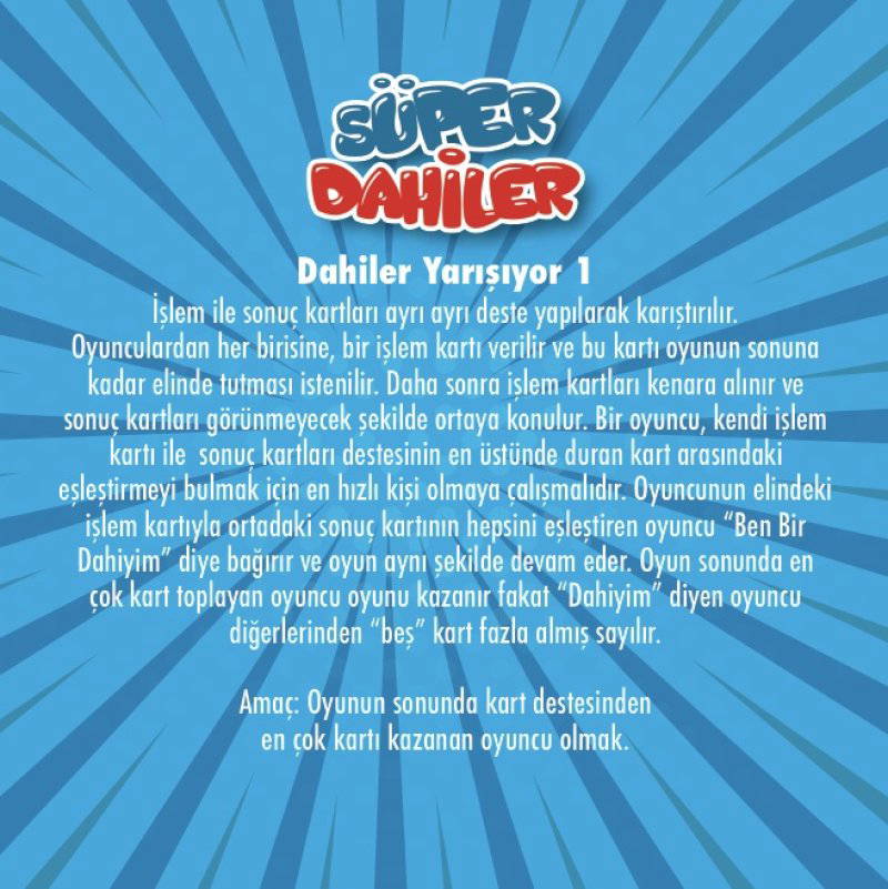 İşlem kartları ile sonuç kartları arasında ya bir ya da tamamını hızlı ve seri bir şekilde eşleştirme oyunudur. Oyun 1-6 kişi arasında 5 modelle oynanabilir. Sınıf içi oyun seçeneğiyle desteklenen oyun hem eğlendiriyor hemde öğretiyor.