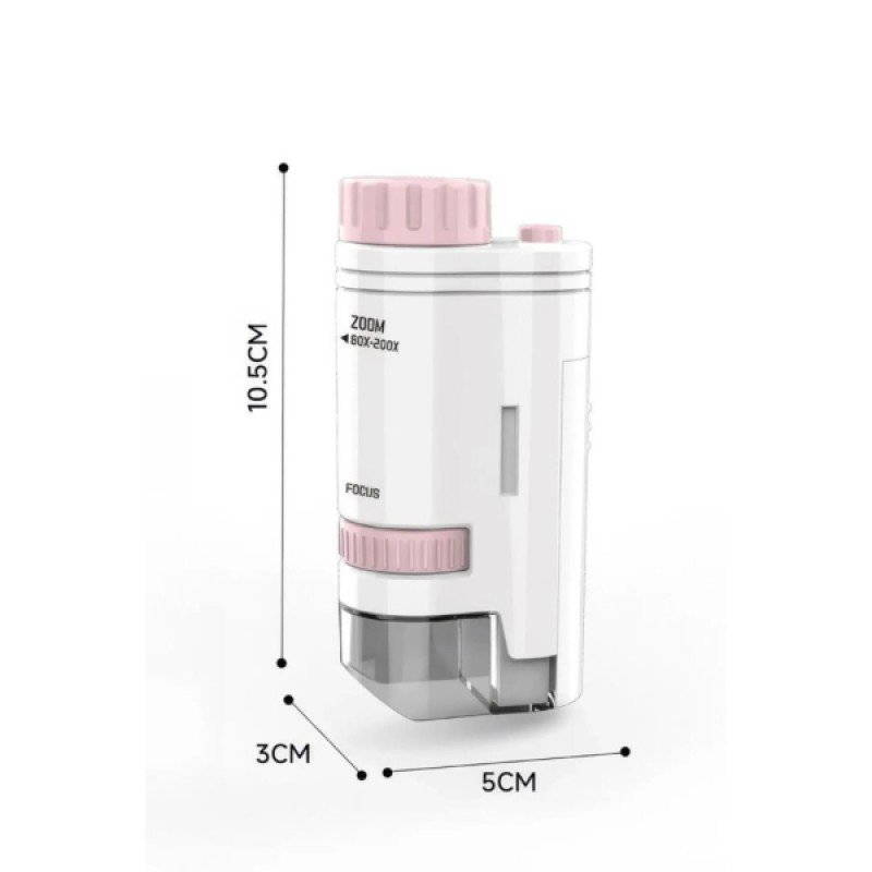Portatif mini mikroskop, 10.5 cm x 5 cm x 3 cm boyutlarıyla kompakt ve taşınabilir bir kullanım sunar.